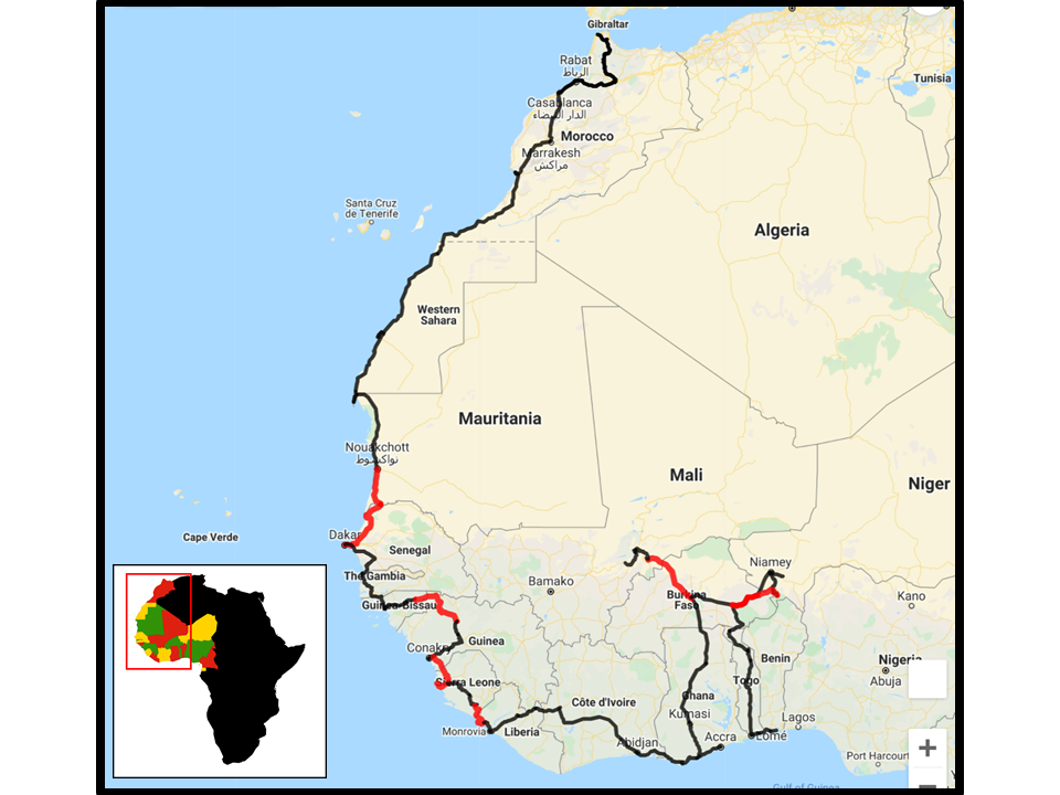 The red lines in the map above were monster travel days; six border crossings where these friendly West Africans helped me reach my destination.